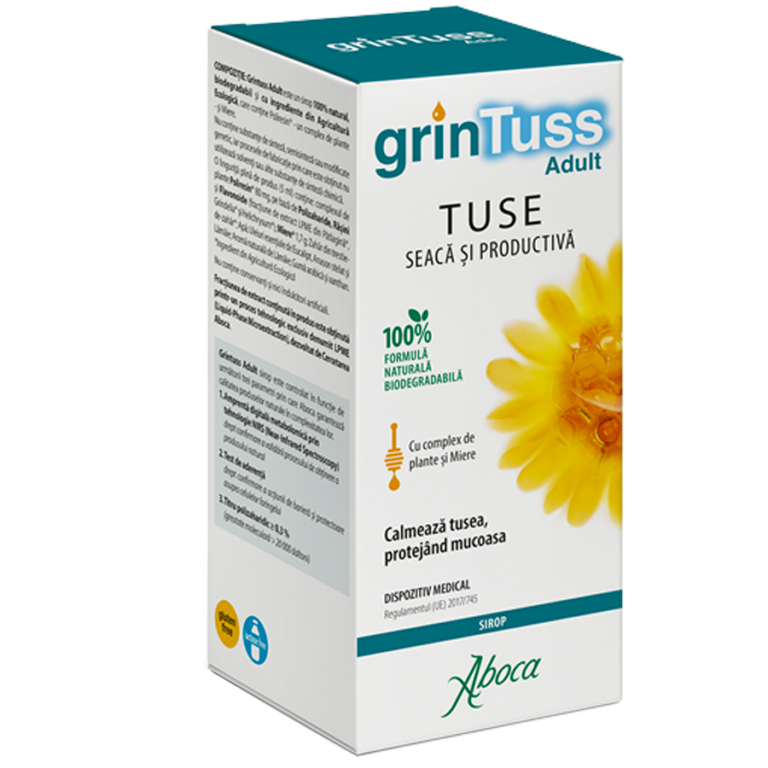 Grintuss Adult este un sirop care acționează atât în faza de tuse seacă, contracarând inflamația mucoasei, cât și în faza cu mucus, favorizând hidratarea și eliminarea acestuia din căile respiratorii superioare.