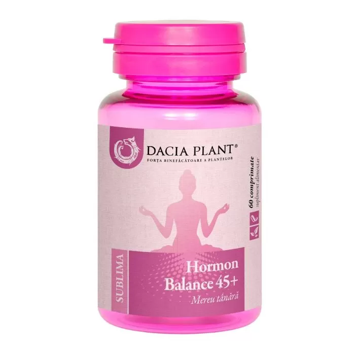 De ce Sublima Hormon Balance +45 de la Dacia Plant? - produs 100% natural, cu extracte de dong quai, cimicifuga si kudzu - combinatie de plante cu rol în eliminarea simptomelor neplăcute care apar la menopauză (bufeuri, transpirații nocturne etc) - produsul contine extracte vegetale concentrate, poate fi administrat de vegani si vegetarieni - fara amidon, gluten, zahar.